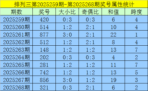 发布日期:2025-10-25 07:50 点击次数:122上期记忆:成列三第2025268期出现奖号321。开出组六,奇偶比2:1,012路比1:1:1,大小比0:3,和值6,跨度2。